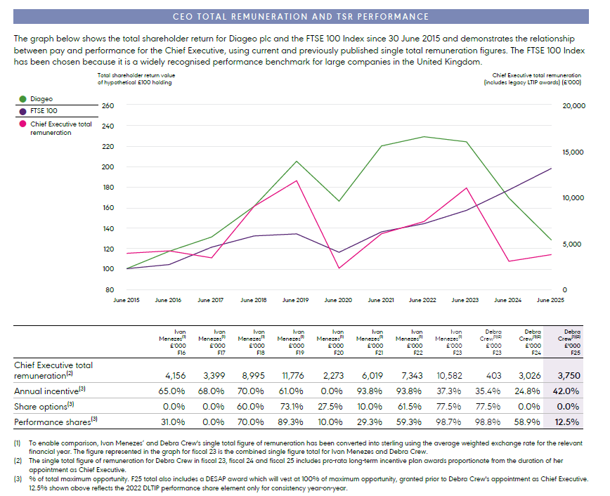The median level of remuneration and resulting pay ratio for 2025 is consistent with the pay and progression policies for Diageo’s UK employees as a whole and reflect the impact of performance-related pay on total remuneration for the year. As the Chief Executive has a larger proportion of her total remuneration linked to business performance than other employees in the UK workforce, the ratio has increased at each quartile in fiscal 25 for the Chief Executive, driven by higher annual incentive and LTI totals when compared to fiscal 24.