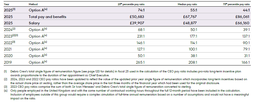 In accordance with The Companies (Miscellaneous Reporting) Regulations 2018, the table below sets out Diageo’s CEO pay ratios for the year ended 30 June 2025. These CEO pay ratios provide a comparison of the Chief Executive’s total remuneration based on Debra Crew’s total single figure of remuneration, converted into sterling, with the equivalent remuneration for the employees paid at the 25th (P25), 50th (P50) and 75th (P75) percentile of Diageo’s workforce in the United Kingdom. Also shown are the salary and total remuneration for each quartile employee.