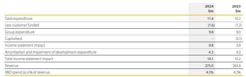 Total investment in research and development (capitalised and expensed) was $11.4m (2023: $10.2m), in line with the prior period as a percentage of revenue. Excluding amortisation and impairment, we have seen an increase in costs expensed to the P&L and lower levels of capitalisation following completion of NG IHPS and ACH Gen II helmet development.