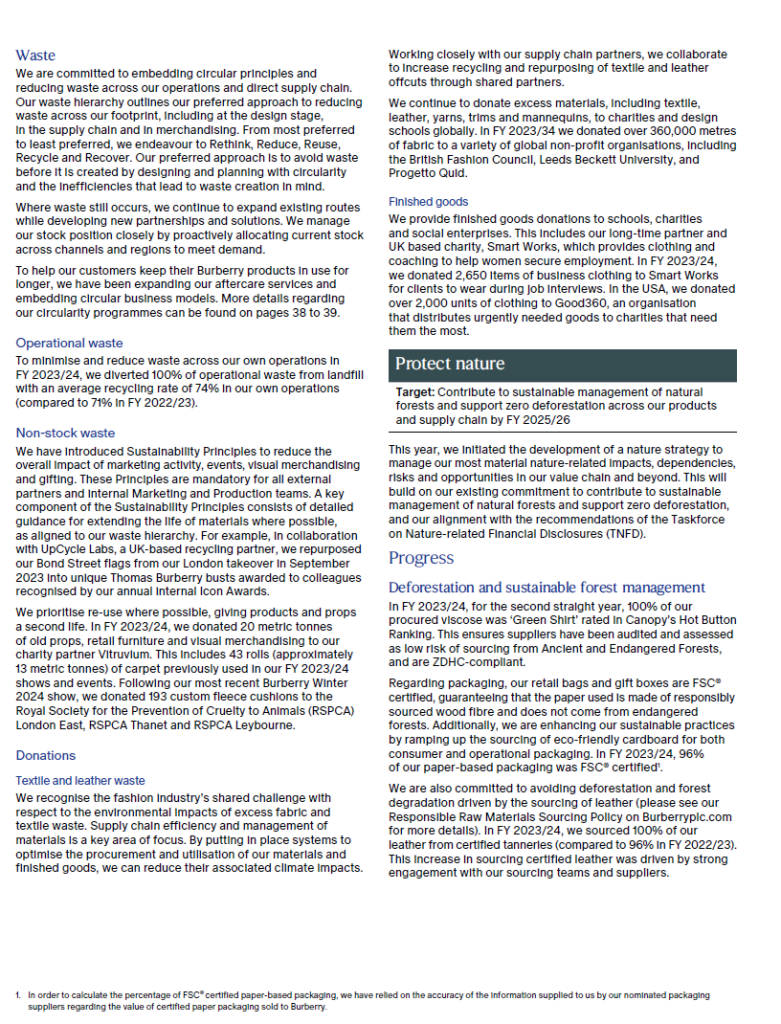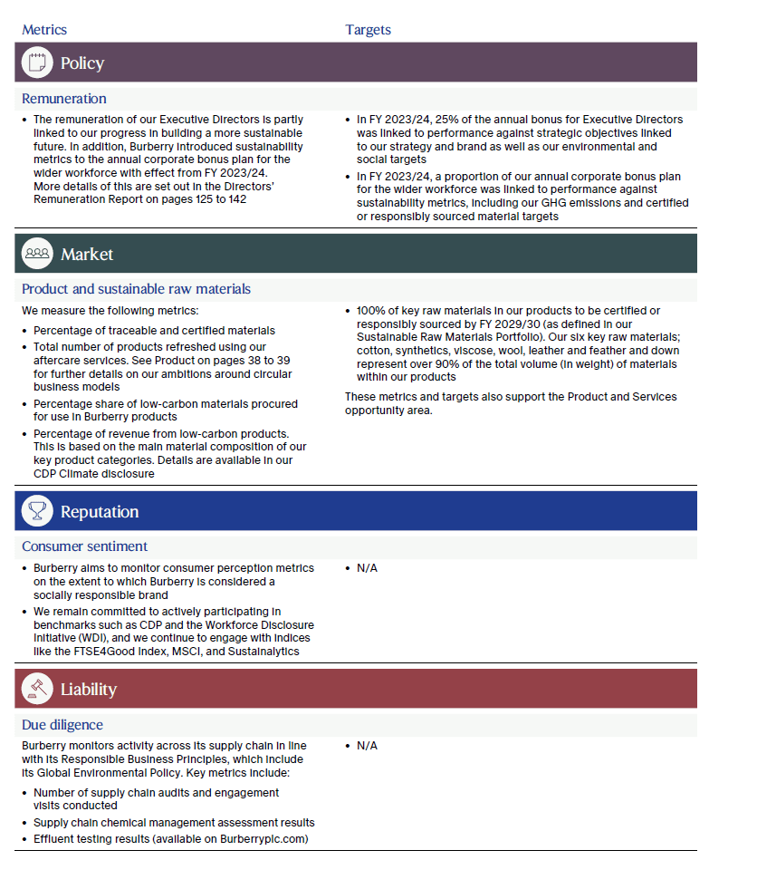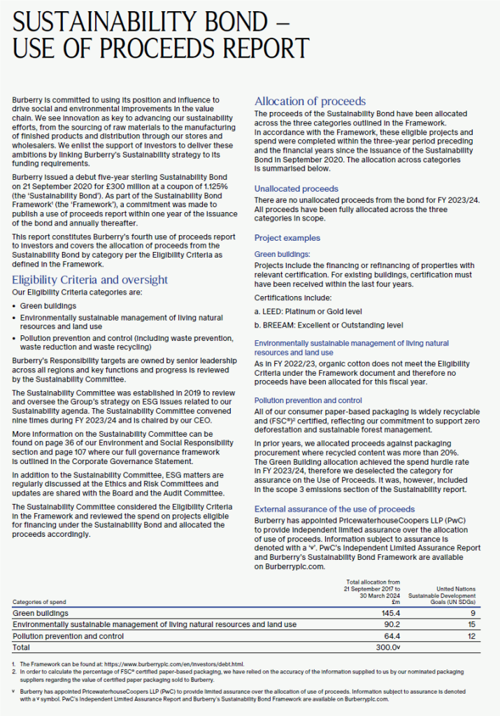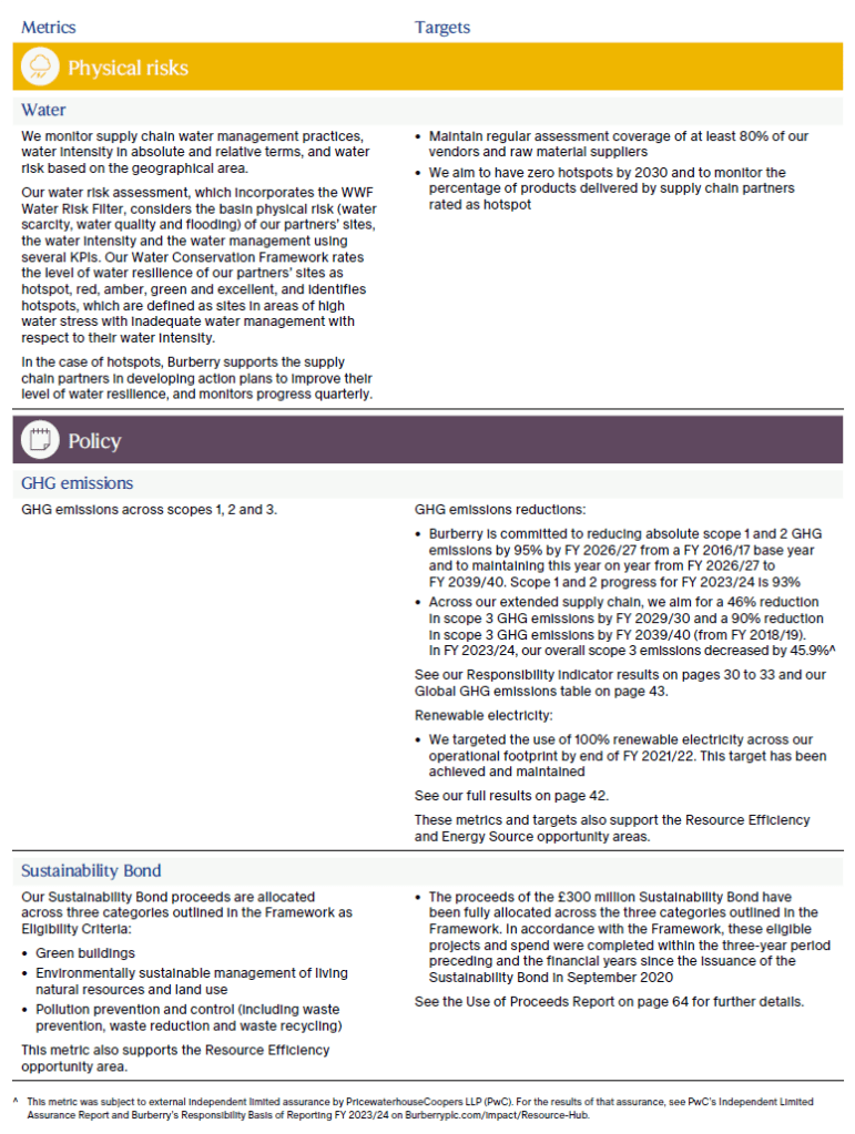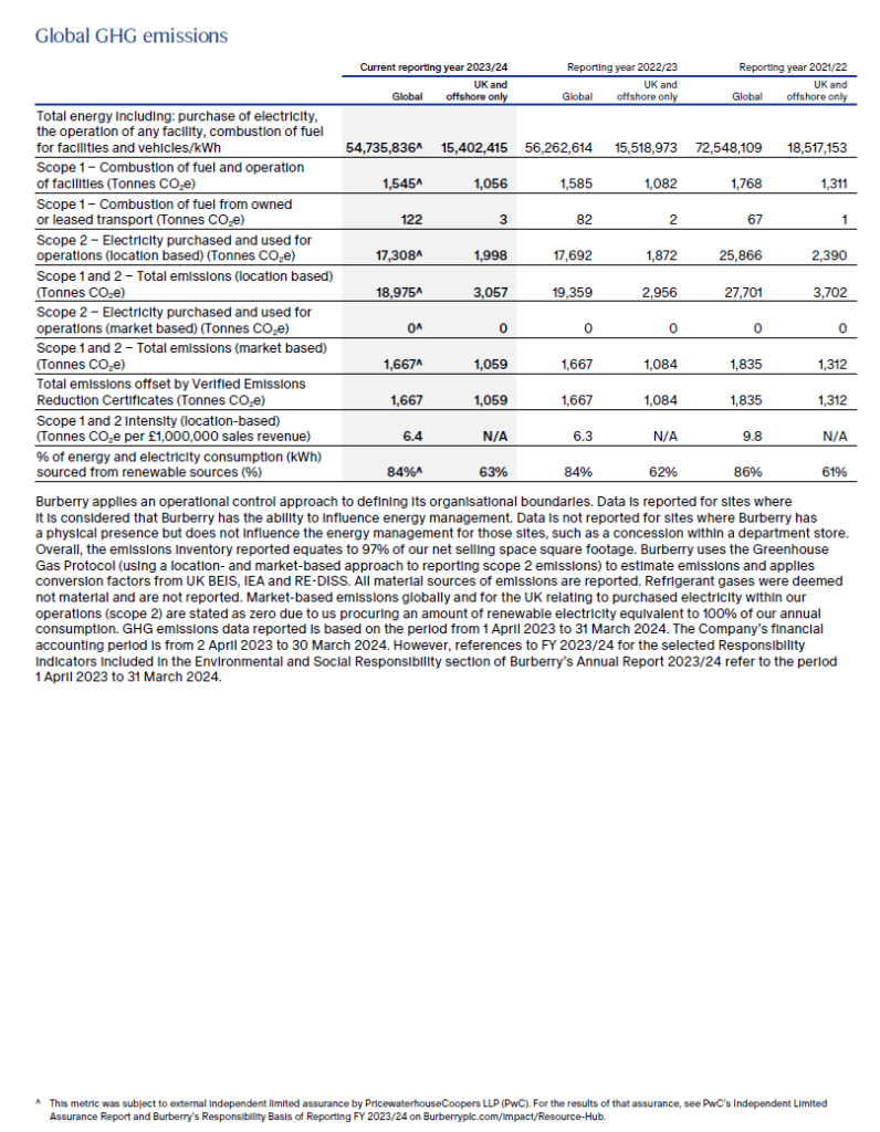 ^ This metric was subject to external independent limited assurance by PricewaterhouseCoopers LLP (PwC). For the results of that assurance, see PwC’s Independent Limited Assurance Report and Burberry’s Responsibility Basis of Reporting FY 2023/24 on Burberryplc.com/impact/Resource-Hub.