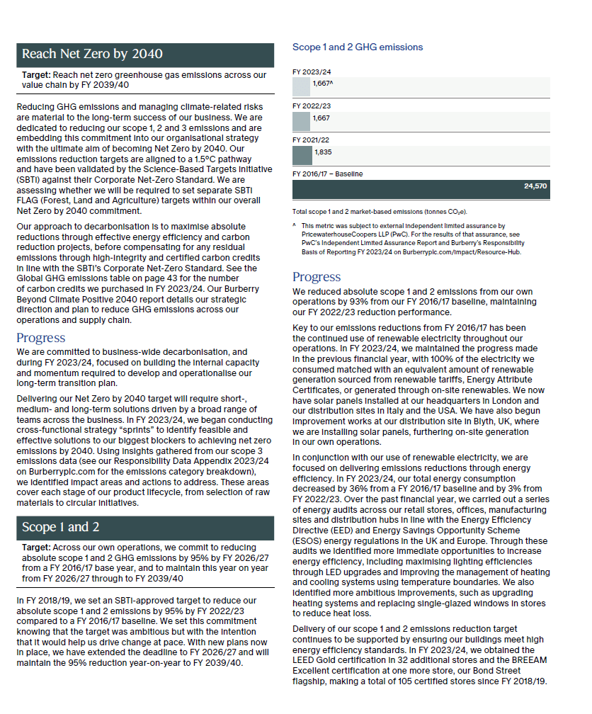 Our climate-related metrics and targets cover renewable energy procurement and GHG emissions reductions across scopes 1, 2 and 3. Burberry has appointed PricewaterhouseCoopers LLP (PwC) to provide independent limited assurance over selected Responsibility indicators as part of our Burberry Beyond strategy, as well as key metrics reported in our Global GHG emissions table on page 43. Metrics assured by PwC are denoted with a ^ throughout this Annual Report.