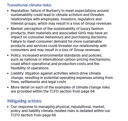 Climate change has been identified as a principal risk to Burberry, see page 86 and has the potential to impact our business in the short, medium and long term, as detailed in the Strategy section on pages 68 to 76.