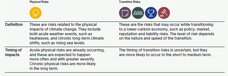 These are defined opposite, alongside a summary of the potential global impact of physical and transition risks under these scenarios.