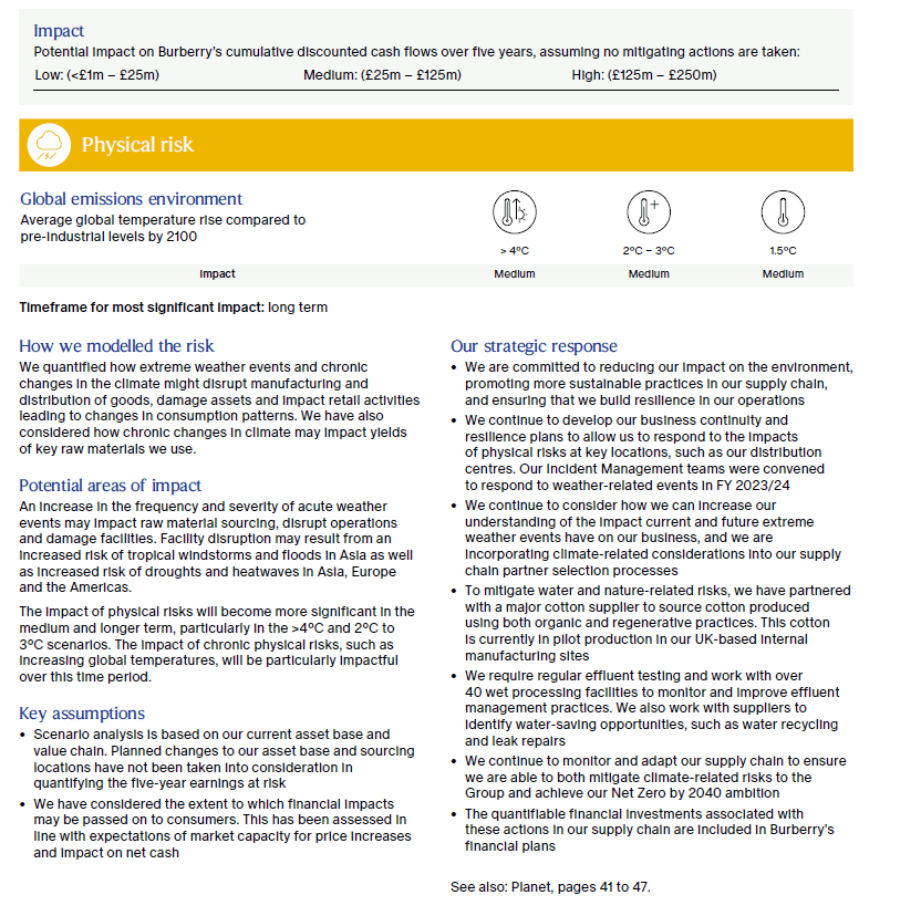 The 1.5°C scenario would have most impact on Burberry in the short-to-medium term before considering any mitigating actions.
