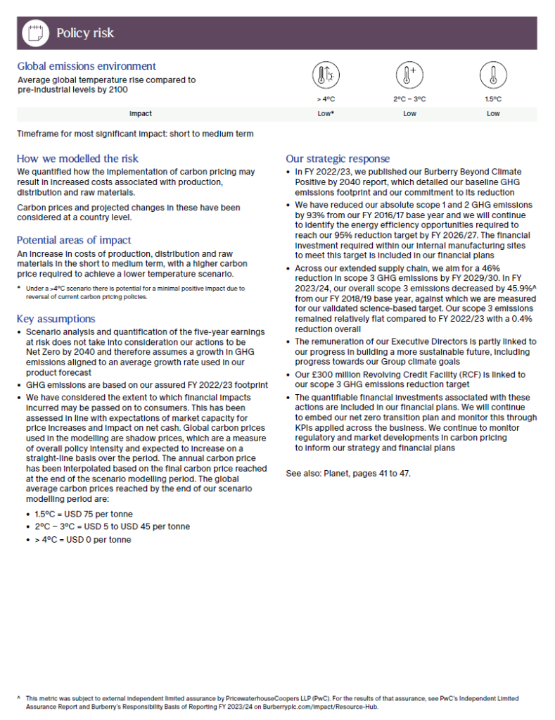The Burberry TCFD Basis of Reporting outlines how we have prepared the Financial Statements and disclosures, considering relevant TCFD guidance publications and the principles for effective disclosure. We have engaged EY as independent auditors to provide a limited assurance statement in accordance with ISAE 3000 on our FY 2023/24 TCFD disclosures. The TCFD Basis of Reporting and Assurance Statement are available on Burberryplc.com.