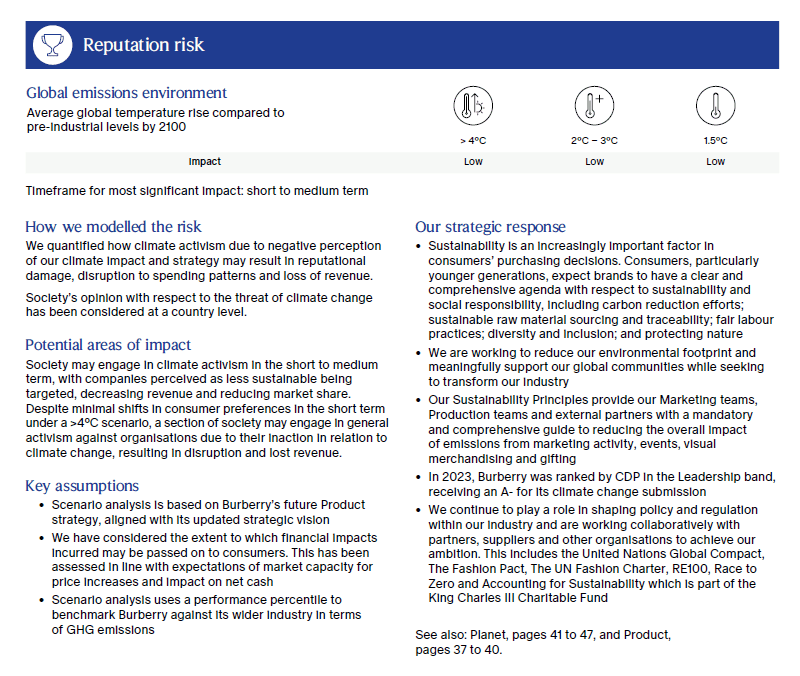 We recognise the potential impact of climate change, which remains a principal risk for the business. While there are challenges ahead, the business is well positioned to both address these and capitalise on the identified opportunities, which will arise in the transition towards a lower-carbon economy. Our net zero ambition will be key in ensuring Burberry’s resilience to the potential impacts of climate change, supported by our wider Burberry Beyond strategy (see Responsibility section pages 35 to 62) and underpinned by ambitious targets, which are detailed in the Metrics and targets section on pages 77 to 78.