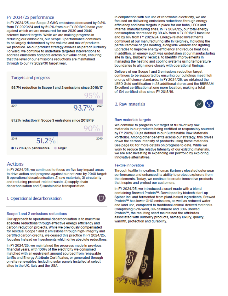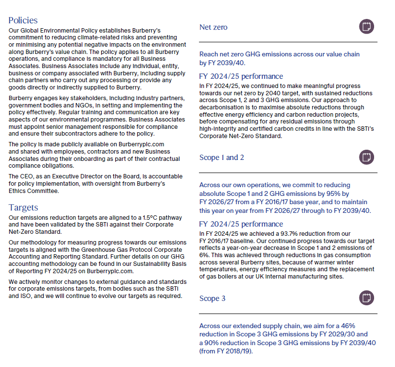 Burberry has a longstanding commitment to addressing the impacts of climate change and is taking significant steps to advance our decarbonisation agenda. Our Scope 1, 2 and 3 emission reduction targets are aligned to a 1.5°C pathway and have been validated by the Science Based Targets initiative (SBTi). Our targets support our climate-related risk mitigation and underpin our Company’s approach to adapting to climate change, providing a framework for our decarbonisation efforts across the value chain.