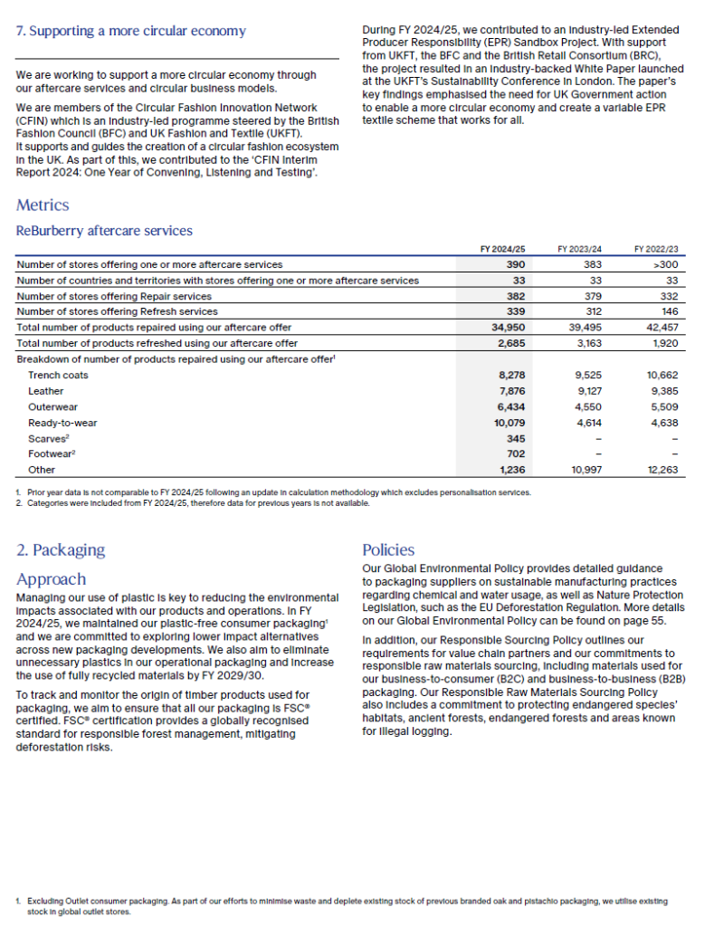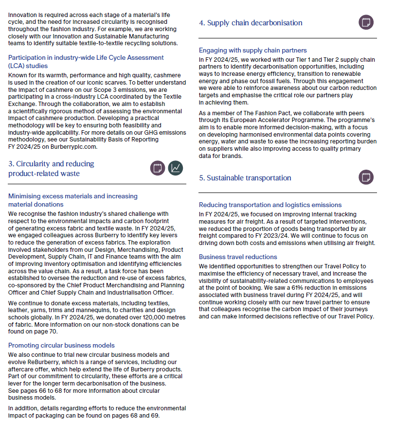 The Company’s strategy on environment-related issues, Burberry Beyond, is governed by the Sustainability Committee, which convened three times in FY 2024/25 and is chaired by the CEO. The Committee plays an important decision-making role in supporting Burberry’s environmental agenda, with membership including senior leaders from across the organisation who are responsible for the execution of the strategy within their respective business areas. In FY 2024/25, topics discussed by the Sustainability Committee included future climate-related disclosure requirements, product sustainability and our ReBurberry services. During FY 2024/25, the Board received two updates from the Sustainability Committee, which included progress against the Company’s sustainability-related goals and targets. The Board also received an update on Burberry’s decarbonisation plans and disclosures.