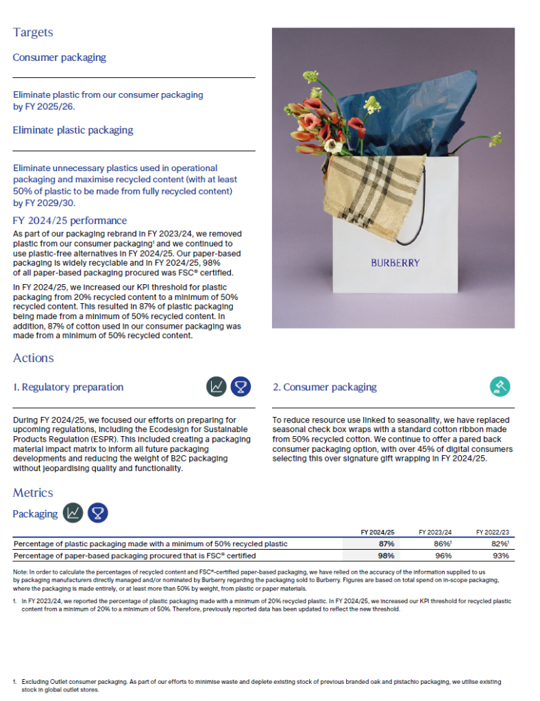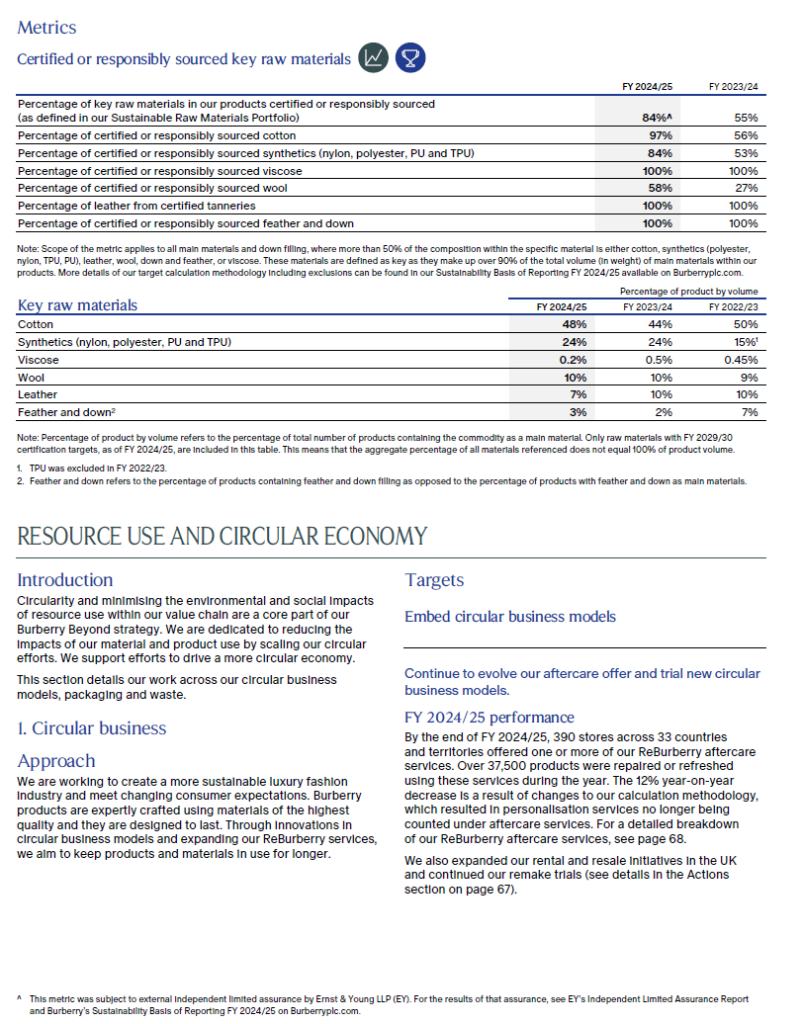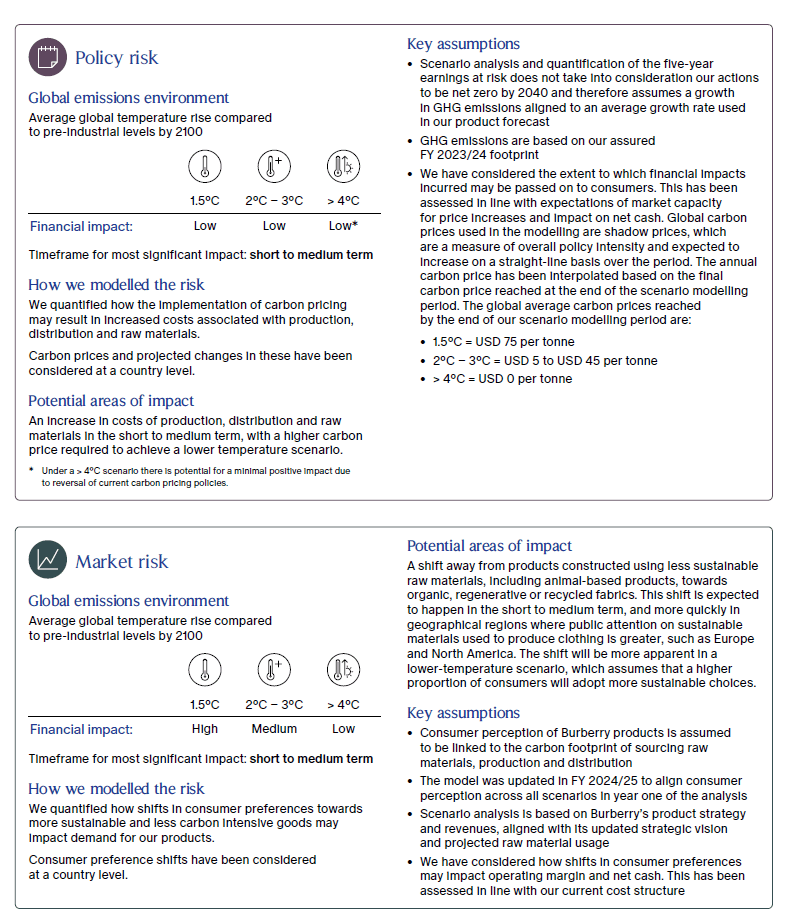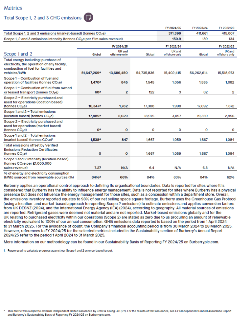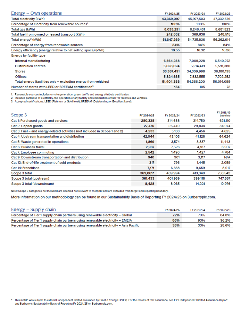 The Burberry TCFD Basis of Reporting outlines how we have prepared the Financial Statements and disclosures, considering relevant TCFD guidance publications and the principles for effective disclosure. We have engaged EY as independent practitioners to provide a limited assurance statement in accordance with ISAE 3000 on our FY 2024/25 TCFD disclosures and specific sustainability data denoted with a ^. For the results of that assurance, see EY’s Independent Limited Assurance Report and Burberry’s TCFD and Sustainability Basis of Reporting FY 2024/25 on Burberryplc.com.