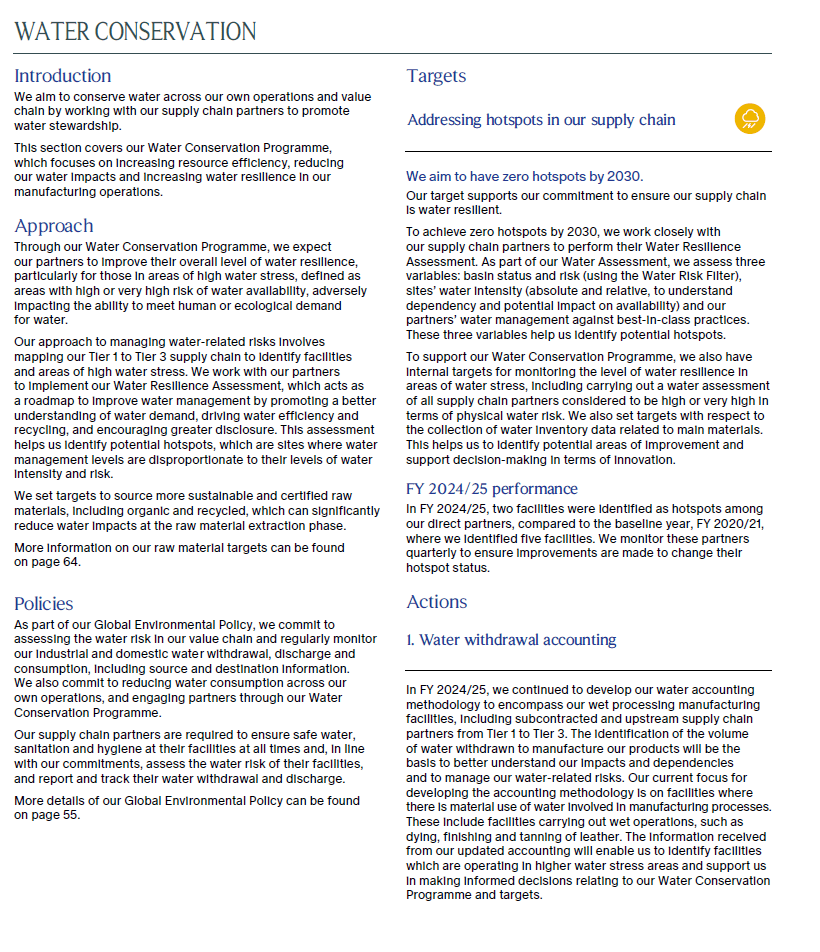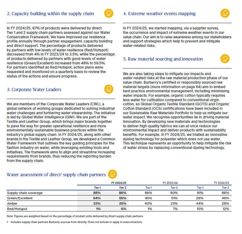Burberry’s heritage is deeply connected to the outdoors and delivering on our environmental commitments is a key area of focus for our Company. The climate crisis, water security and biodiversity loss are significant challenges faced by businesses and society at large. Our ability to address these challenges will play an important role in Burberry’s long-term success. This section highlights how our Burberry Beyond strategy mitigates risks, realises opportunities and supports the management of our most significant environmental impacts and dependencies.