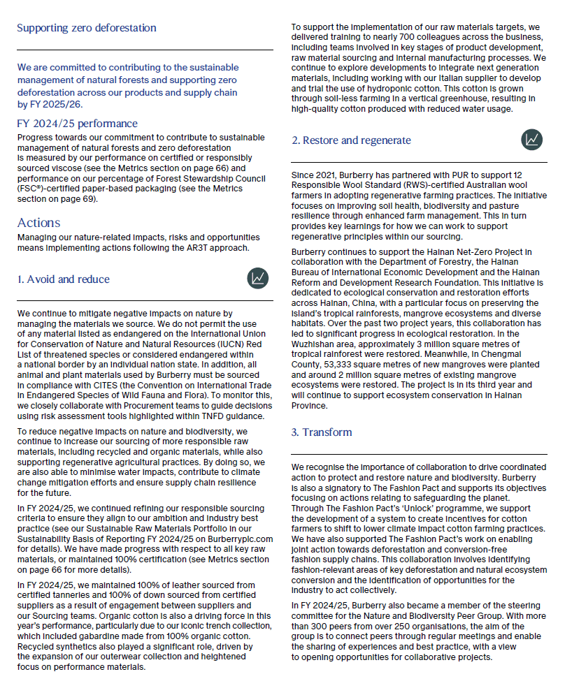 We are building capabilities across the business to ensure teams have the relevant sustainability-related knowledge and skills to support decision-making. Team members involved in the execution of the Burberry Beyond strategy participate in external training courses and educational events, including the Accounting for Sustainability (A4S) Academy, to keep abreast of relevant climate- and nature-related topics. We will continue to expand our sustainability training, with a particular focus on developing the relevant skills, knowledge and competencies required for colleagues to contribute to the delivery of our strategy.