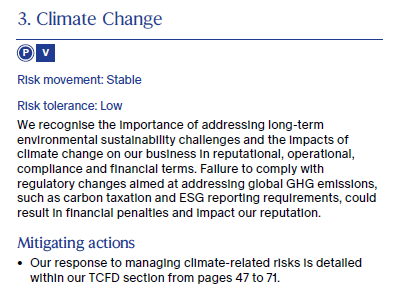 When sustainability-related risks are assessed, existing mitigating activities and controls are highlighted and, where relevant and appropriate, additional activities and controls are implemented if risks fall outside of risk tolerance. Progress against these mitigating activities is assessed by the appropriate committee responsible for monitoring the associated risk (as described in the Management oversight section on page 41).