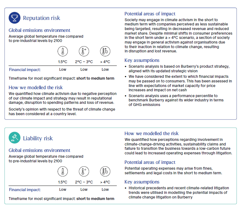 Climate change has been identified as a principal risk to Burberry and has the potential to impact our business in the short, medium and long term. Our strategy to address climate‑related risks is integrated into our business strategy and decision-making in areas such as capital allocation, investment appraisal, supply chain planning and raw material sourcing.