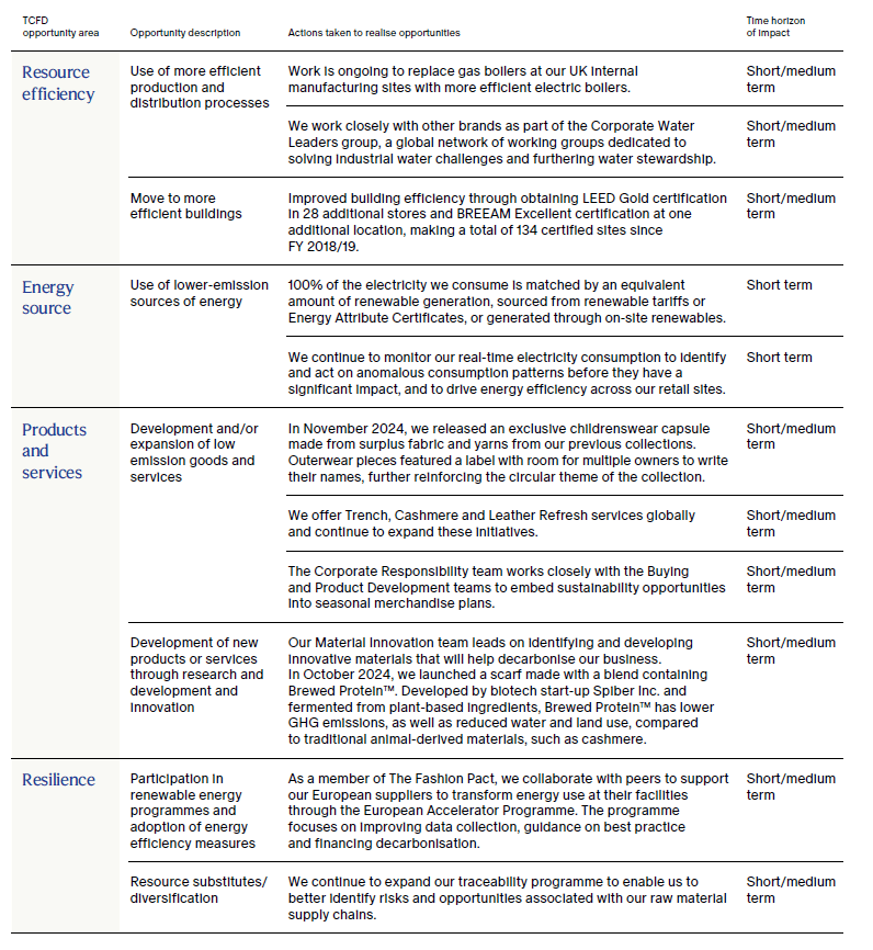 In addition to climate-related risks quantified through scenario analysis, Burberry continues to identify and act upon climate-related opportunities aimed at supporting the Company’s overarching net zero ambition. The Sustainability Committee plays a pivotal role in identifying, prioritising and realising climate-related opportunities. The Committee receives pertinent opportunities from internal teams working on the environmental agenda, which are then evaluated for feasibility and potential impact, as well as their alignment with key priorities.
