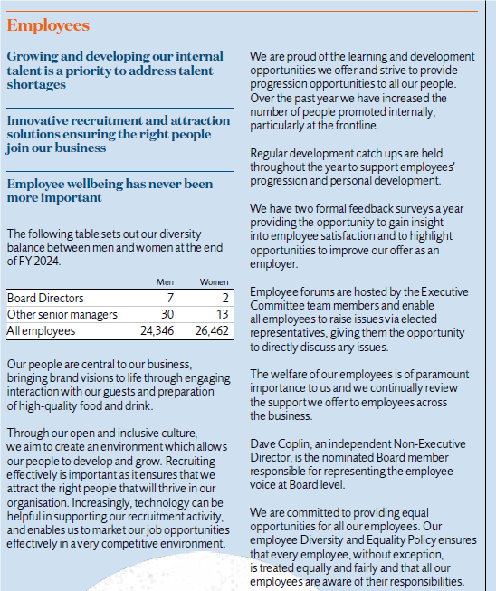 Updates on employee matters are normally presented to the Remuneration Committee or Board at least twice a year and cover a wide range of issues. Over the course of FY 2024 these updates have focused on employee engagement and specifically detailed feedback from the two engagement surveys held during the year, a review of bonus and incentive schemes below Executive Committee level, progress against our diversity and inclusion agenda and plans to roll out a new talent management system that will help to support the development of our people.