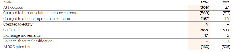 Provisions arising from uncertain tax positions taken in the calculation of tax assets and liabilities are included within current and deferred tax liabilities. At 30 September 2024 the total value of these provisions excluding offsetting assets under mutual agreement procedure was £365 million (2023: £261 million excluding offsetting assets). The assessment of uncertain tax positions is subjective and significant management judgement is required. This judgement is based on current interpretation of legislation, management experience and professional advice. Until matters are finally concluded it is possible that amounts ultimately paid will be different from the amounts provided.